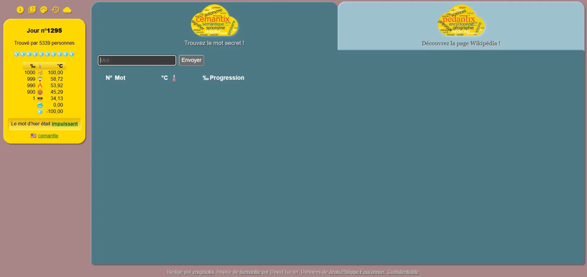 Le principe est simple mais addictif : Cemantix vous propose un mot secret, et vos essais sont classés par proximité sémantique. Plus l’indice est élevé, plus vous êtes proche de la bonne réponse. C’est un jeu de patience, de logique et parfois de culture générale.